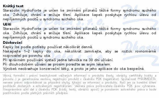 Starazolin HydroForte je určen ke zmírnění příznaků těžké formy syndromu suchého oka. Zvlhčuje, chrání a snižuje tření. Aplikace kapek poskytuje rychlou úlevu od nepříjemných pocitů u syndromu suchého oka.