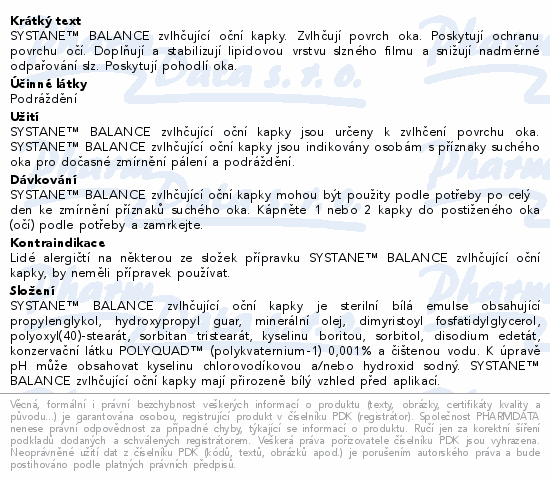 SYSTANE™ BALANCE zvlhčující oční kapky. Zvlhčují povrch oka. Poskytují ochranu povrchu očí. Doplňují a stabilizují lipidovou vrstvu slzného filmu a snižují nadměrné odpařování slz. Poskytují pohodlí oka.