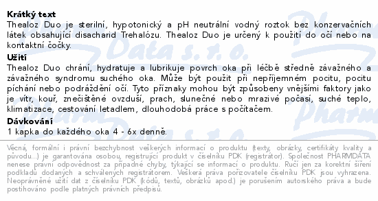 Thealoz Duo je sterilní, hypotonický a pH neutrální vodný roztok bez konzervačních látek obsahující disacharid Trehalózu. Thealoz Duo je určený k použití do očí nebo na kontaktní čočky.