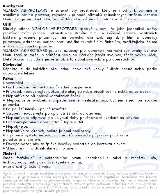 VIZALOR AB-PROTEARS je zdravotnický prostředek, který je vhodný k ochraně a stabilizaci očního povrchu, zejména v případě příznaků způsobených změnou slzného filmu, jako je zarudnutí oka, podráždění oka vnějšími činiteli nebo suché oko.