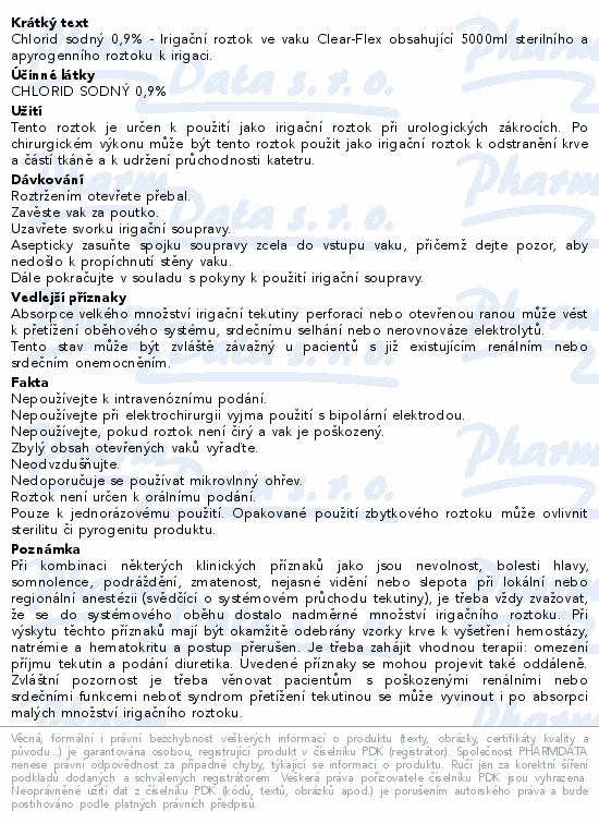 Chlorid sodný 0,9% - Irigační roztok ve vaku Clear-Flex obsahující 5000ml sterilního a apyrogenního roztoku k irigaci.