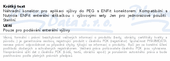 Náhradní konektor pro aplikaci výživy do PEG s ENFit konektorem. Kompatibilní s Nutricia ENFit enterální stříkačkou i výživovými sety. Jen pro jednorázové použití. Sterilní.