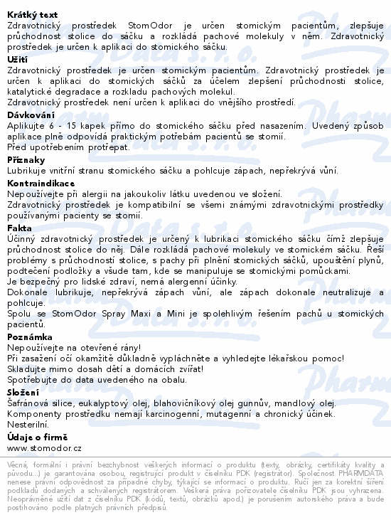Zdravotnický prostředek StomOdor je určen stomickým pacientům, zlepšuje průchodnost stolice do sáčku a rozkládá pachové molekuly v něm. Zdravotnický prostředek je určen k aplikaci do stomického sáčku.