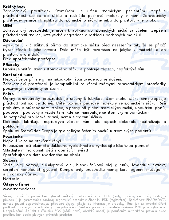 Zdravotnický prostředek StomOdor je určen stomickým pacientům, zlepšuje průchodnost stolice do sáčku a rozkládá pachové molekuly v něm. Zdravotnický prostředek je určen k aplikaci do stomického sáčku a/nebo do prostoru v jeho okolí.