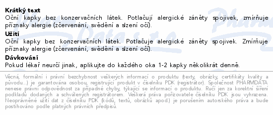 Oční kapky bez konzervačních látek. Potlačují alergické záněty spojivek, zmírňuje příznaky alergie (zčervenání, svědění a slzení očí).