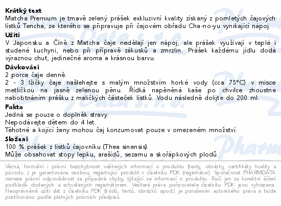 Matcha Premium je tmavě zelený prášek exkluzivní kvality získaný z pomletých čajových lístků Tencha, ze kterého se připravuje při čajovém obřadu Cha-no-yu vynikající nápoj.