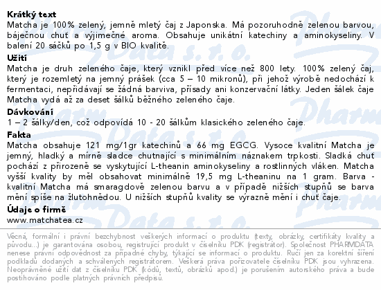 Matcha je 100% zelený, jemně mletý čaj z Japonska. Má pozoruhodně zelenou barvou, báječnou chuť a výjimečné aroma. Obsahuje unikátní katechiny a aminokyseliny. V balení 20 sáčků po 1,5 g v BIO kvalitě.