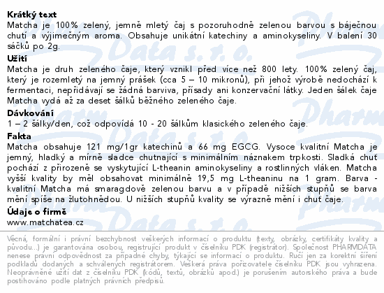 Matcha je 100% zelený, jemně mletý čaj s pozoruhodně zelenou barvou s báječnou chutí a výjimečným aroma. Obsahuje unikátní katechiny a aminokyseliny. V balení 30 sáčků po 2g.