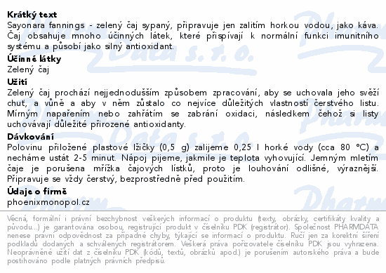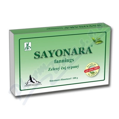 Sayonara fannings - zelený čaj sypaný, připravuje jen zalitím horkou vodou, jako káva. Čaj obsahuje mnoho účinných látek, které přispívají k normální funkci imunitního systému a působí jako silný antioxidant.
