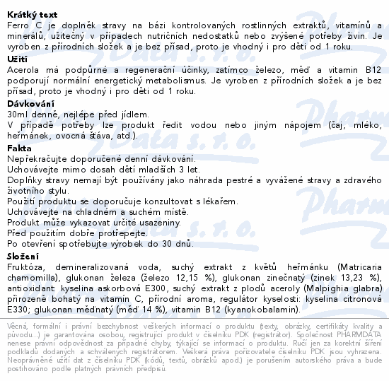 Ferro C je doplněk stravy na bázi kontrolovaných rostlinných extraktů, vitamínů a minerálů, užitečný v případech nutričních nedostatků nebo zvýšené potřeby živin. Je vyroben z přírodních složek a je bez přísad, proto je vhodný i pro děti od 1 roku.