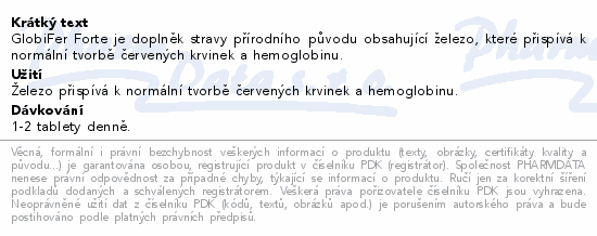 GlobiFer forte je doplněk stravy obsahující unikátní formu železa, která napomáhá efektivnímu vstřebávání a využití železa v organismu, je pro lidské tělo biologicky dostupnější a lépe vstřebatelné než běžné formy železa. Přípravek je určen k doplnění železa při jeho nedostatku nebo zvýšené potřebě, například u žen v období menstruace, těhotenství nebo kojení, u dárců krve, sportovců, dětí a dospívajících nebo seniorů.