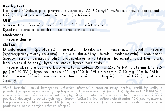 Liposomální železo pro správnou krvetvorbu. Až 3,5x vyšší vstřebatelnost v porovnání s běžným pyrofosfátem železitým. Šetrný k trávení.