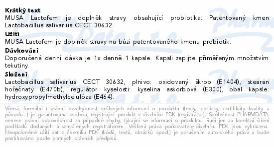 MUSA Lactofem je doplněk stravy obsahující probiotika. Patentovaný kmen Lactobacillus salivarius CECT 30632.