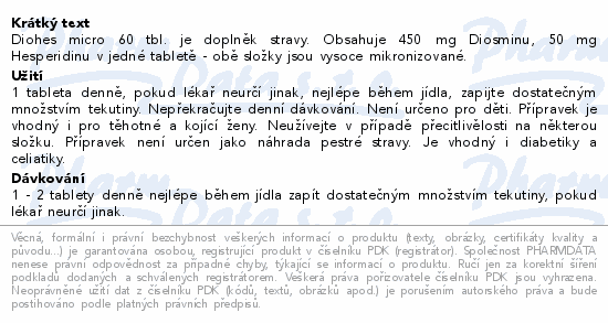 Diohes micro 60 tbl. je doplněk stravy. Obsahuje 450 mg Diosminu, 50 mg Hesperidinu v jedné tabletě - obě složky jsou vysoce mikronizované.