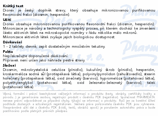 Diorex je český doplněk stravy, který obsahuje mikronizovanou purifikovanou flavonoidní frakci (diosmin, hesperidin).