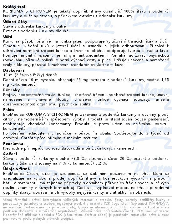 KURKUMA S CITRONEM je tekutý doplněk stravy obsahující 100% šťávu z oddenků kurkumy a dužniny citronu, s přídavkem extraktu z oddenku kurkumy.