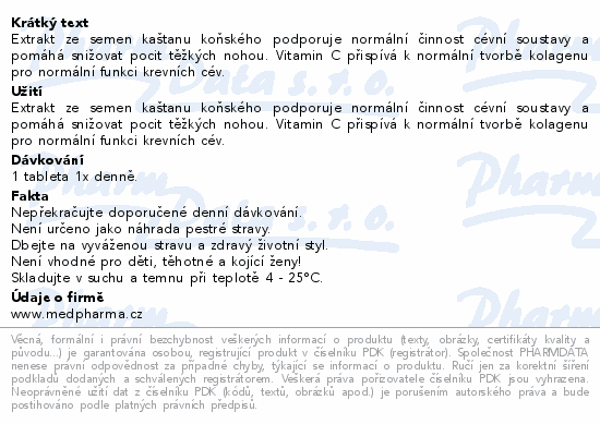 Extrakt ze semen kaštanu koňského podporuje normální činnost cévní soustavy a pomáhá snižovat pocit těžkých nohou. Vitamin C přispívá k normální tvorbě kolagenu pro normální funkci krevních cév.