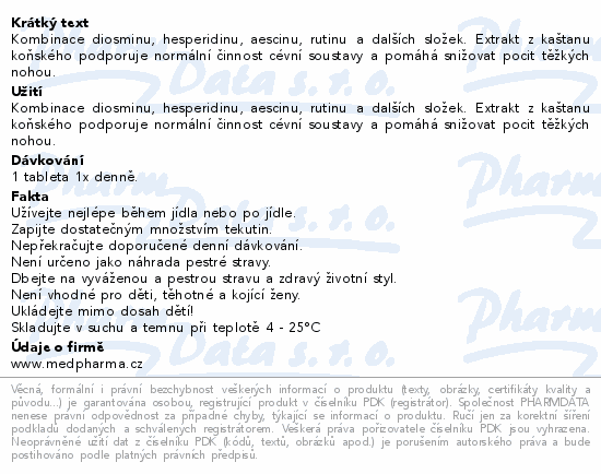 Kombinace diosminu, hesperidinu, aescinu, rutinu a dalších složek. Extrakt z kaštanu koňského podporuje normální činnost cévní soustavy a pomáhá snižovat pocit těžkých nohou.
