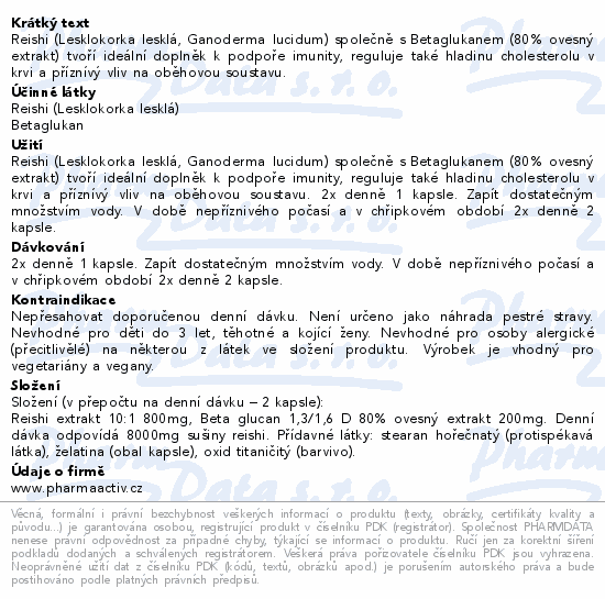Reishi (Lesklokorka lesklá, Ganoderma lucidum) společně s Betaglukanem (80% ovesný extrakt) tvoří ideální doplněk k podpoře imunity, reguluje také hladinu cholesterolu v krvi a příznívý vliv na oběhovou soustavu.