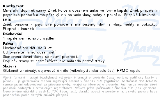 Minerální doplněk stravy Zinek Forte s obsahem zinku ve formě kapslí. Zinek přispívá k psychické pohodě a má příznivý vliv na vaše vlasy, nehty a pokožku. Přispívá k imunitě.