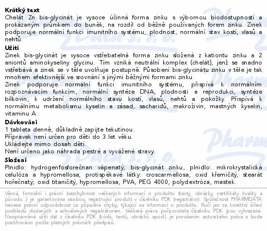 Chelát Zn bis-glycinát je vysoce účinná forma zinku s výbornou biodostupností a prokázaným průnikem do buněk, na rozdíl od běžně používaných forem zinku. Zinek podporuje normální funkci imunitního systému, plodnost, normální stav kostí, vlasů a nehtů.