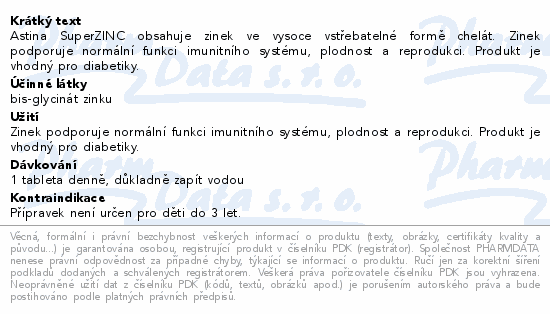 Astina SuperZINC obsahuje zinek ve vysoce vstřebatelné formě chelát. Zinek podporuje normální funkci imunitního systému, plodnost a reprodukci. Produkt je vhodný pro diabetiky.
