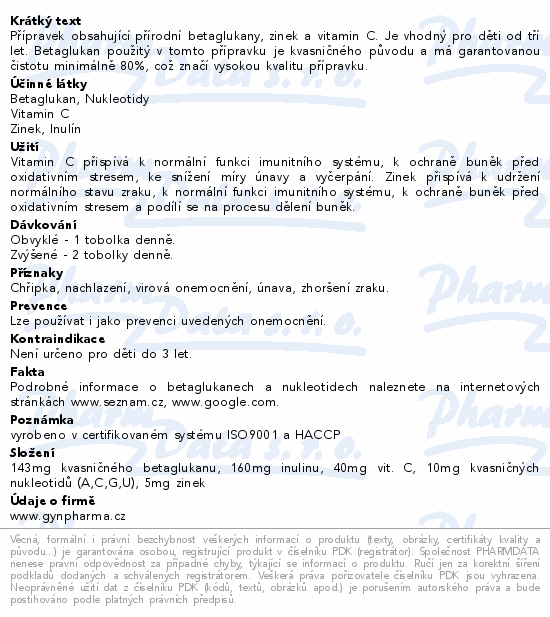 100 mg čistého betaglukanu, 150 mg inulínu, 40 mg vitaminu C, 5 mg zinku a nukleotidy v jedné tobolce.