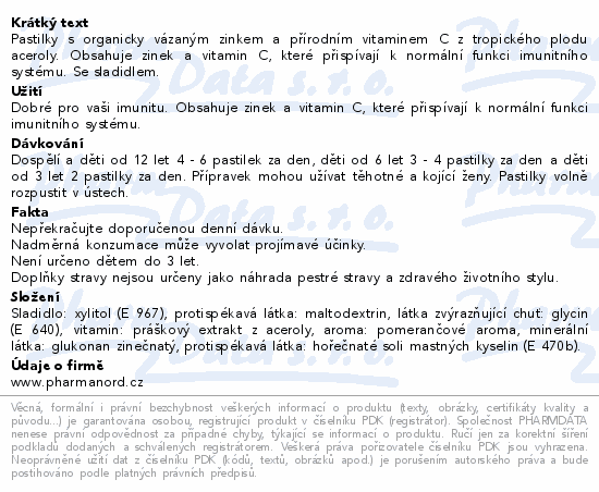 Pastilky s organicky vázaným zinkem a přírodním vitaminem C z tropického plodu aceroly. Obsahuje zinek a vitamin C, které přispívají k normální funkci imunitního systému. Se sladidlem.