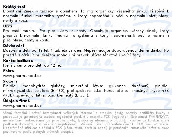 Bioaktivní Zinek - tablety s obsahem 15 mg organicky vázaného zinku. Přispívá k normální funkci imunitního systému a který napomáhá k péči o normální pleť, vlasy, nehty a kosti.