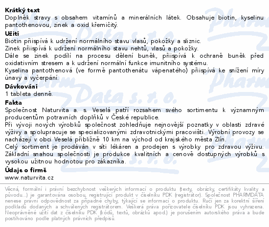 Doplněk stravy s obsahem vitamínů a minerálních látek. Obsahuje biotin, kyselinu pantothenovou, zinek a oxid křemičitý.