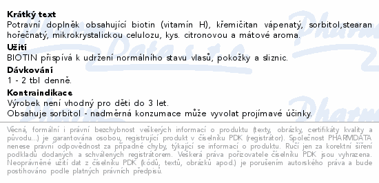 Potravní doplněk obsahující biotin (vitamín H), křemičitan vápenatý, sorbitol,stearan hořečnatý, mikrokrystalickou celulozu, kys. citronovou a mátové aroma.