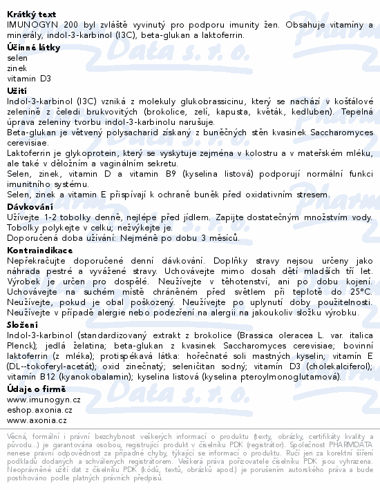 IMUNOGYN 200 byl zvláště vyvinutý pro podporu imunity žen. Obsahuje vitamíny a minerály, indol-3-karbinol (I3C), beta-glukan a laktoferrin.