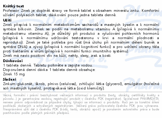 Professor Zinek je doplněk stravy ve formě tablet s obsahem minerálu zinku. Komfortní užívání polykacích tablet, dávkování pouze jedna tableta denně.