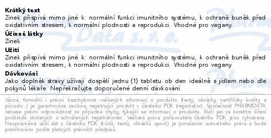 Zinek přispívá mimo jiné k: normální funkci imunitního systému, k ochraně buněk před oxidativním stresem, k normální plodnosti a reprodukci. Vhodné pro vegany.