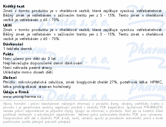 Zinek v tomto produktu je v chelátové vazbě, která zajišťuje vysokou vstřebatelnost. Běžný zinek je vstřebáván v zažívacím traktu jen z 5-15%. Tento zinek v chelátové vazbě je vstřebáván z 60-70%.
