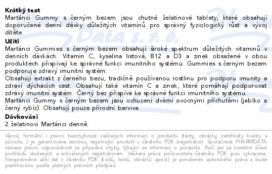 Marťánci Gummy s černým bezem jsou chutné želatinové tablety, které obsahují doporučené denní dávky důležitých vitamínů pro správný fyziologický růst a vývoj dítěte.