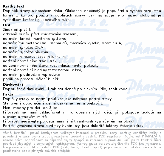Doplněk stravy s obsahem zinku. Glukonan zinečnatý je populární a vysoce rozpustná forma zinku pro použití v doplňcích stravy. Jak naznačuje jeho název, glukonát je výsledkem kvašení glukózového cukru.