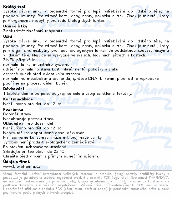 Vysoká dávka zinku v organické formě pro lepší vstřebávání do lidského těla, na podporu imunity. Pro zdravé kosti, vlasy, nehty, pokožku a zrak. Zinek je minerál, který je v organismu nezbytný pro řadu biologických funkcí.