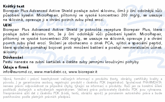 Biorepair Plus Advanced Active Shield posiluje zubní sklovinu, čímž ji činí odolnější vůči působení kyselin. MicroRepair, přítomný ve vysoké koncentraci 200 mg/g, se usazuje na sklovině, opravuje ji a chrání povrch zubu před erozí.