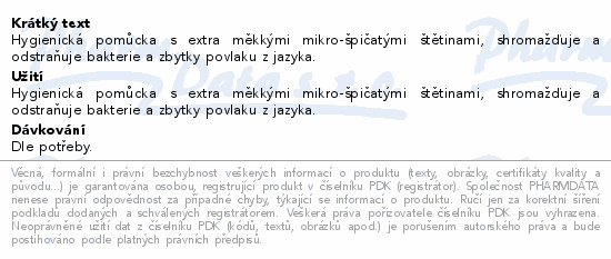 Hygienická pomůcka s extra měkkými mikro-špičatými štětinami, shromažďuje a odstraňuje bakterie a zbytky povlaku z jazyka.