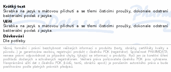 Škrabka na jazyk s mátovou příchutí a se třemi čisticími proužky, dokonale odstraní bakteriální povlak z jazyka.