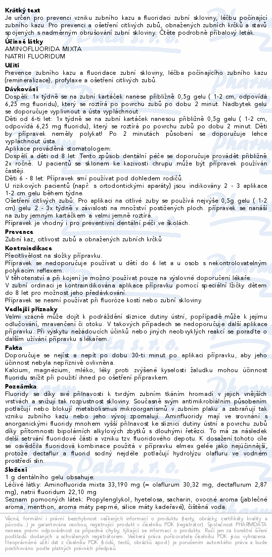 Je určen pro prevenci vzniku zubního kazu a fluoridaci zubní skloviny, léčbu počínající zubního kazu. Pro prevenci a ošetření citlivých zubů, obnažených zubních krčků a stavů spojených s nadměrným obrušování zubní skloviny. Čtěte pozorně příbalový leták.