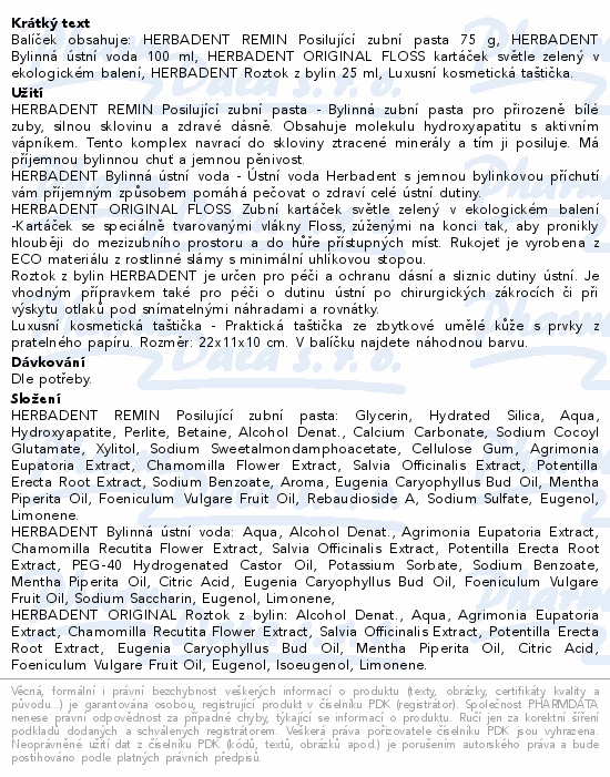 Balíček obsahuje: HERBADENT REMIN Posilující zubní pasta 75 g, HERBADENT Bylinná ústní voda 100 ml, HERBADENT ORIGINAL FLOSS kartáček světle zelený v ekologickém balení, HERBADENT Roztok z bylin 25 ml, Luxusní kosmetická taštička.
