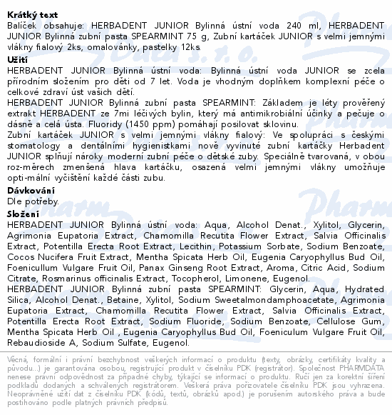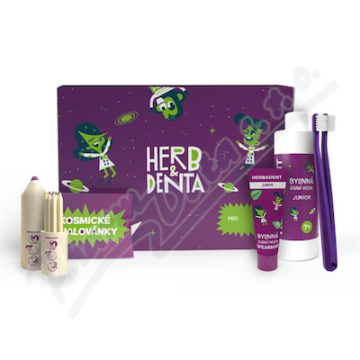 Balíček obsahuje: HERBADENT JUNIOR Bylinná ústní voda 240 ml, HERBADENT JUNIOR Bylinná zubní pasta SPEARMINT 75 g, Zubní kartáček JUNIOR s velmi jemnými vlákny fialový 2ks, omalovánky, pastelky 12ks.