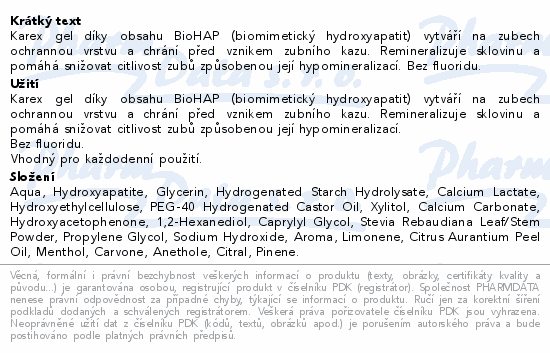 Karex gel díky obsahu BioHAP (biomimetický hydroxyapatit) vytváří na zubech ochrannou vrstvu a chrání před vznikem zubního kazu. Remineralizuje sklovinu a pomáhá snižovat citlivost zubů způsobenou její hypomineralizací. Bez fluoridu.