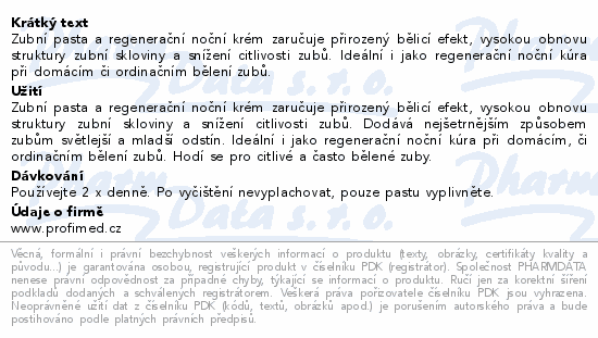 Zubní pasta a regenerační noční krém zaručuje přirozený bělicí efekt, vysokou obnovu struktury zubní skloviny a snížení citlivosti zubů. Ideální i jako regenerační noční kúra při domácím či ordinačním bělení zubů.