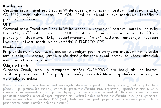 Cestovní sada Travel set Black is White obsahuje kompaktní cestovní kartáček na zuby CS 5460, svěží zubní pastu BE YOU 10ml na bělení a dva mezizubní kartáčky s praktickým držákem.