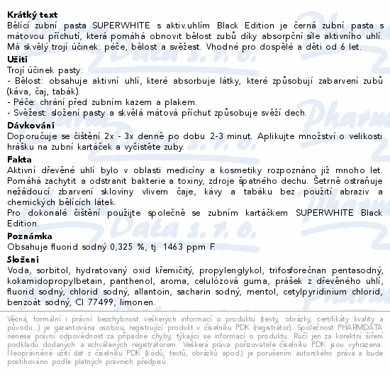 Bělící zubní pasta SUPERWHITE s aktiv.uhlím Black Edition je černá zubní pasta s mátovou příchutí, která pomáhá obnovit bělost zubů díky absorpční síle aktivního uhlí. Má skvělý trojí účinek: péče, bělost a svěžest. Vhodné pro dospělé a děti od 6 let.