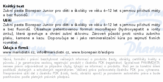 Zubní pasta Biorepair Junior pro děti a školáky ve věku 6–12 let s jemnou příchutí máty a bez fluoridů.