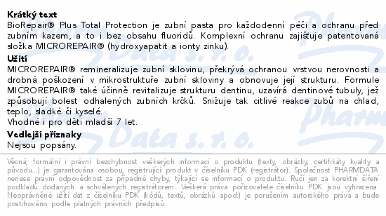 BioRepair® Plus Total Protection je zubní pasta pro každodenní péči a ochranu před zubním kazem, a to i bez obsahu fluoridů. Komplexní ochranu zajišťuje patentovaná složka MICROREPAIR® (hydroxyapatit a ionty zinku).